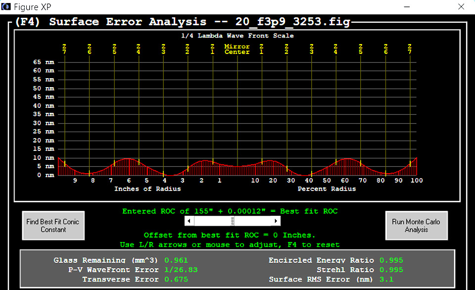 The Normal vector (per Fig-1 equation 2) of the form y=mx+b is y=-z'x+zz'+h, where zz'+h is the b term. Knowing z, the other side of that right triangle is found using similar triangles where the derivative z' serves as the other triangle with similar sides. Derivative z' and 1/z' are used in many places in Fig-1 in this manner which has greatly simplified this new version of the LIT equations, which gets exactly the same results as the old. Excels Solver (Root finder) is used to find the numerical solution to the LIT differential equations, which can be simply summarized as: z is varied (using a Root finder) until Yz of Fig-2 equation 12 is nearly equals to Ym (the slit images as measured by ImageJ). Instead of using Z=-Kz of Fig-4 to compute the Foucault, Z=(h-Rz'+zz')/z' is used instead being it avoids multiplying by K=-0 when the conic is a sphere. |